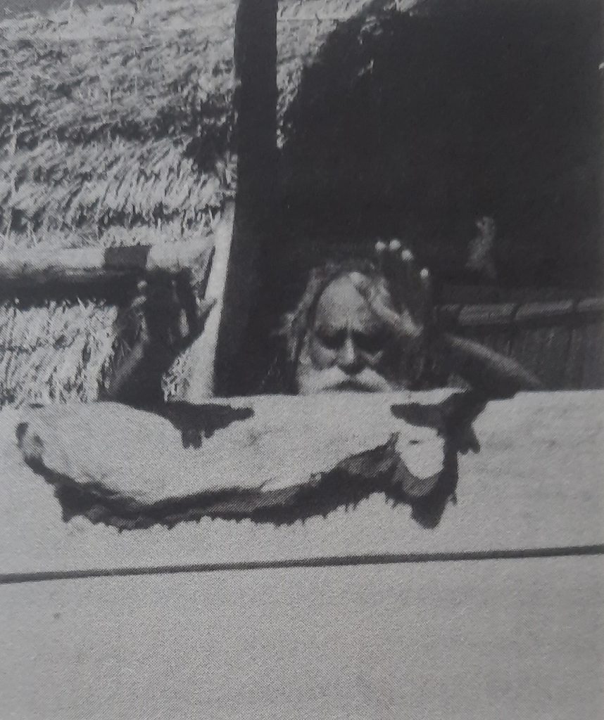 Baba usually sat on the narrow wooden balcony that was supported by poles. One could only see his head with the unkempt, long hair and the aged, bluish eyes. His arms were hanging down from the balustrade and he often raised his hands to give his blessing.