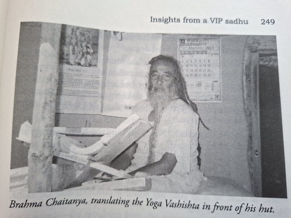 On the compound next to Yoga Niketan, right above the gorge of the Ganga, three sadhus were living in simple huts. One of those sadhus sat the whole day on his tiny veranda and devotedly scribbled into a big book placed on a wooden stand before him. Two more big books were spread out near him. He translated the Yoga Vashishtha into English using both the Hindi and Sanskrit versions for reference. The Yoga Vashishtha is an ancient teaching, which the guru Vashishtha imparted to Ram, the prince of Ayodhya, when he came back from a pilgrimage and had lost all interest in worldly life.